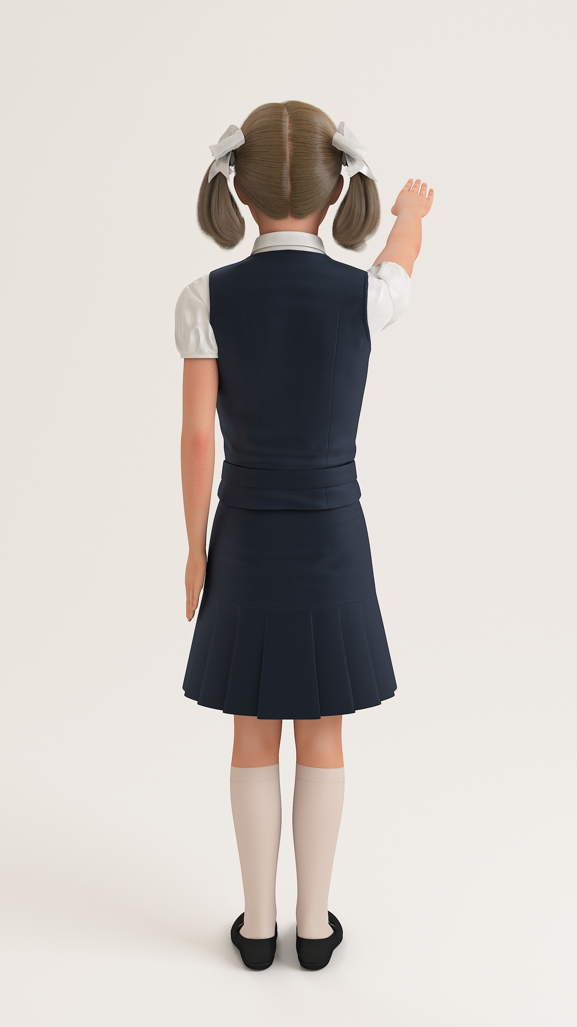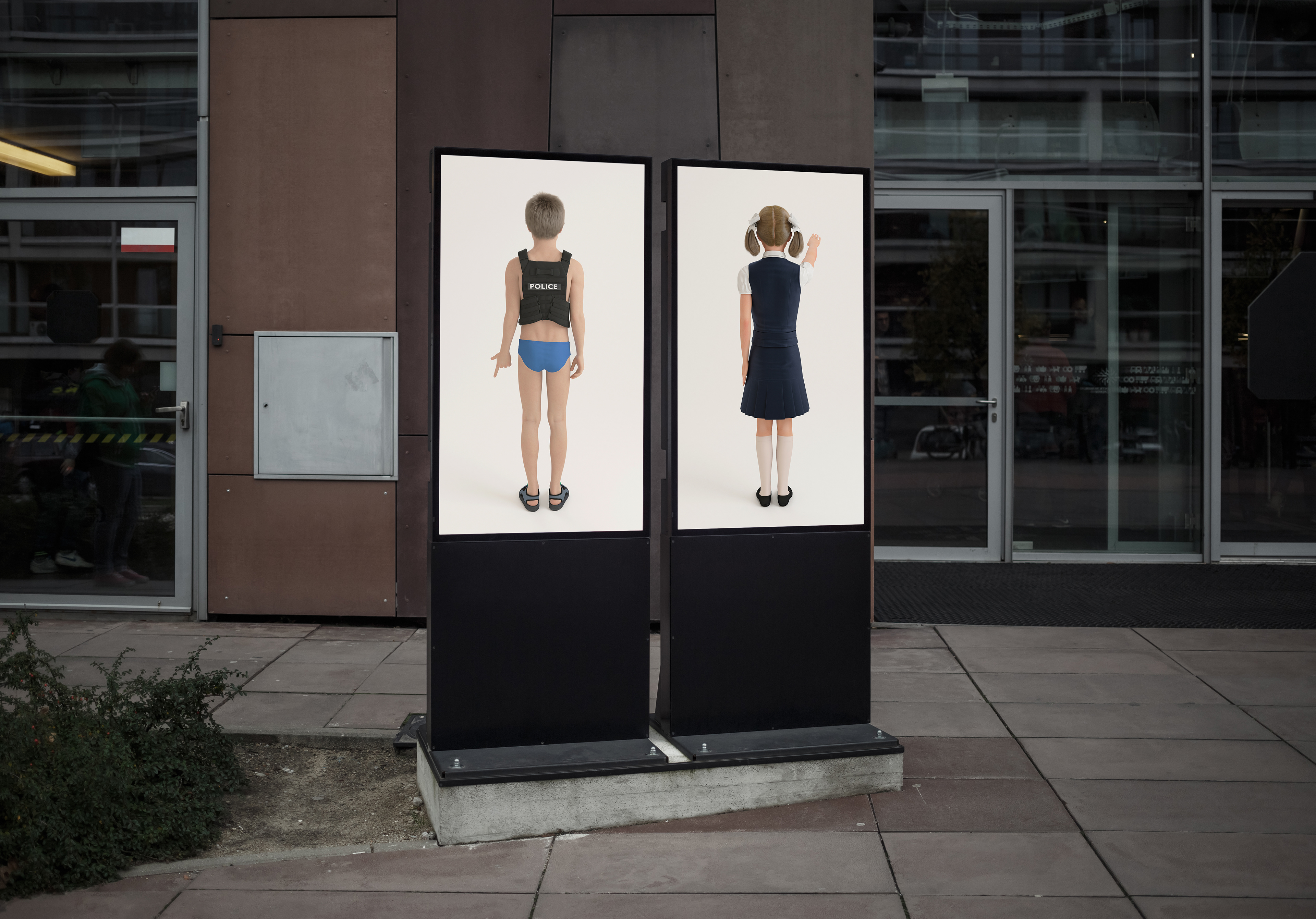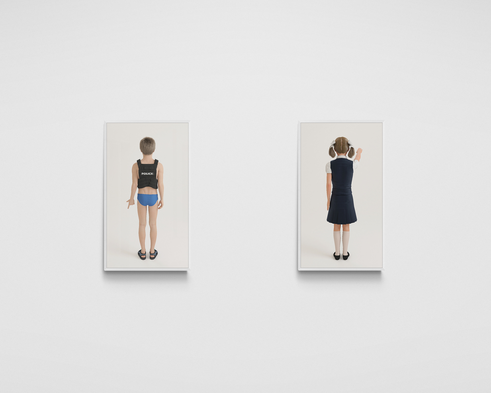 This video installation centers on two child figures, shown with their backs to the viewer, whose subtle breathing movements affirm the presence of life while simultaneously creating an unsettling atmosphere. The artist juxtaposes symbols of violence and authority—such as the bulletproof vest, the uniform, the raised right hand, and the rigid posture—with the imagery of children. This dissonant combination provokes conflicting emotions in the viewer. Their posture, turned away from the audience, further intensifies a sense of distance and estrangement. The viewer cannot meet their gaze, cannot establish a direct emotional connection, but can only observe their backs and the symbols imposed upon them.