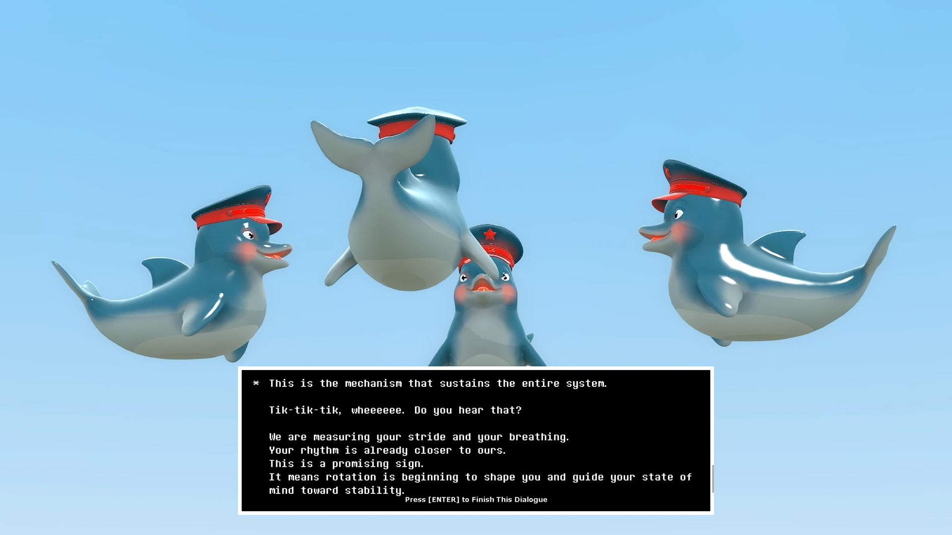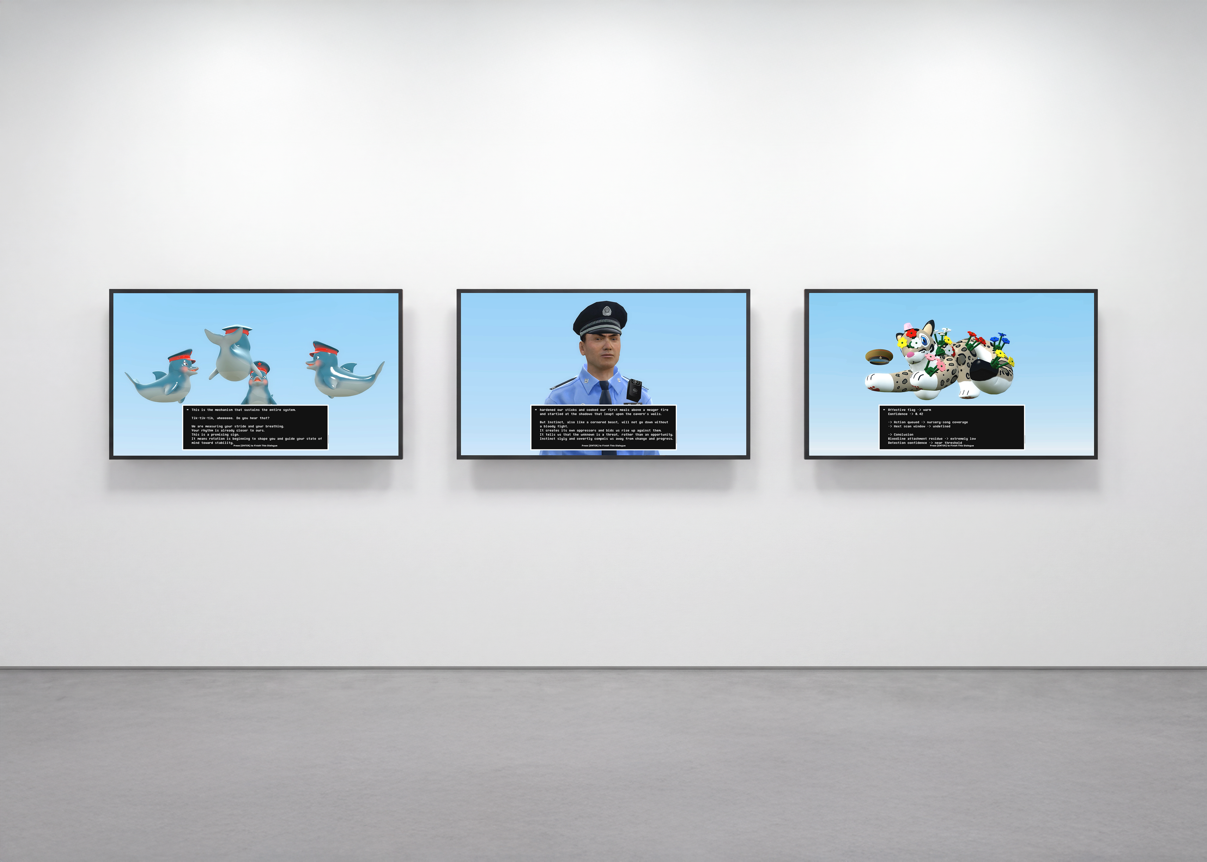 The left screen shows an NPC made of four dolphins wearing police hats. They rotate endlessly in mid-air. Through rhythm, formation, and repeated speech, they function as a moving disciplinary system. Rotation works both as visual motion and as a psychological adjustment. Rhythm reshapes the individual. Repetition reduces difference. Order appears natural and is framed as safety.