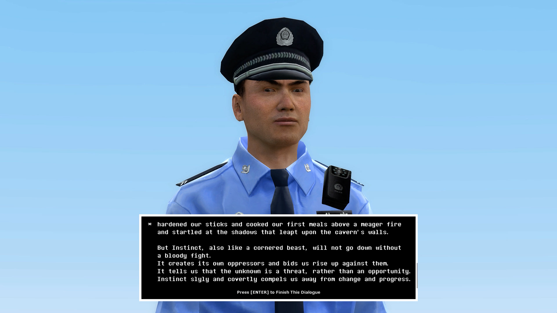 On the central screen, the NPC appears wearing a Chinese police uniform. He acts as a representative of the Republic and as an interpreter of its ideology. His language remains calm and internally consistent. It avoids direct violence and emotional threat. Through repeated use of terms such as progress, collaboration, future, and rational planning, he performs a slow and systematic purification of family, bloodline, instinct, and personal desire. This extended and controlled form of persuasion presents power as logical, self-justifying, and beyond question.